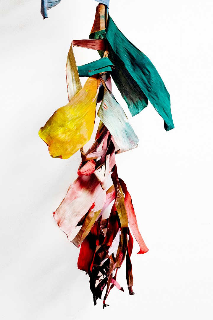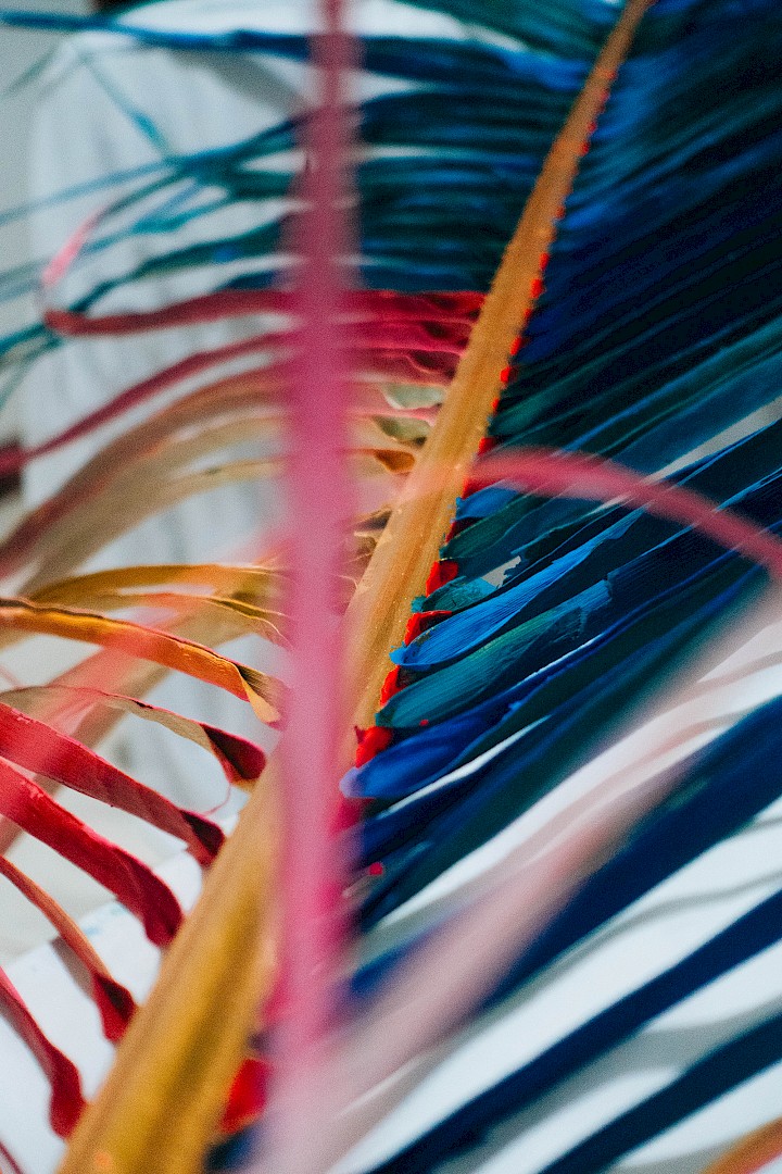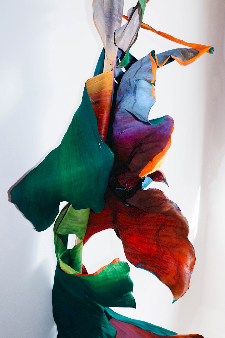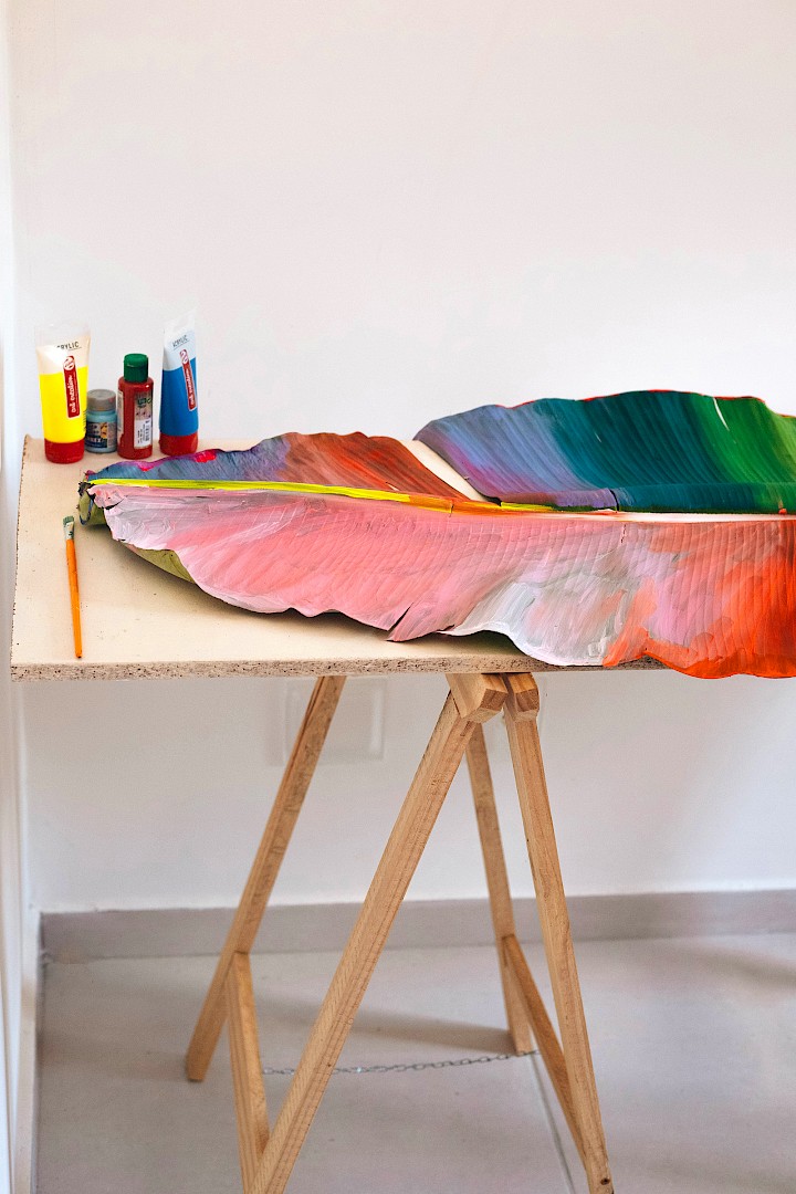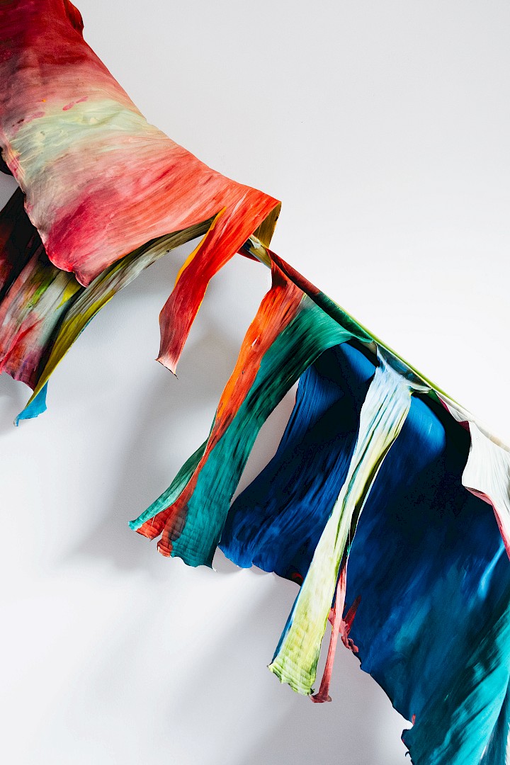 Dans LA HOJARASCA, Elsa Leydier explore notre rapport paradoxal à la nature, entre fascination et destruction. Elle intervient directement sur des feuilles tropicales (palmiers, bananiers, etc.), choisies pour leur forte charge symbolique dans l'imaginaire occidental, en leur appliquant de la peinture. Les végétaux, une fois peints, s'asphyxient et se figent, passant d'éléments vivants à des sculptures fragiles.