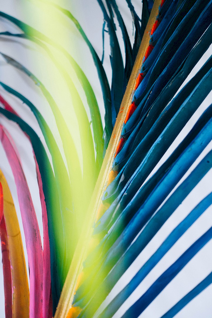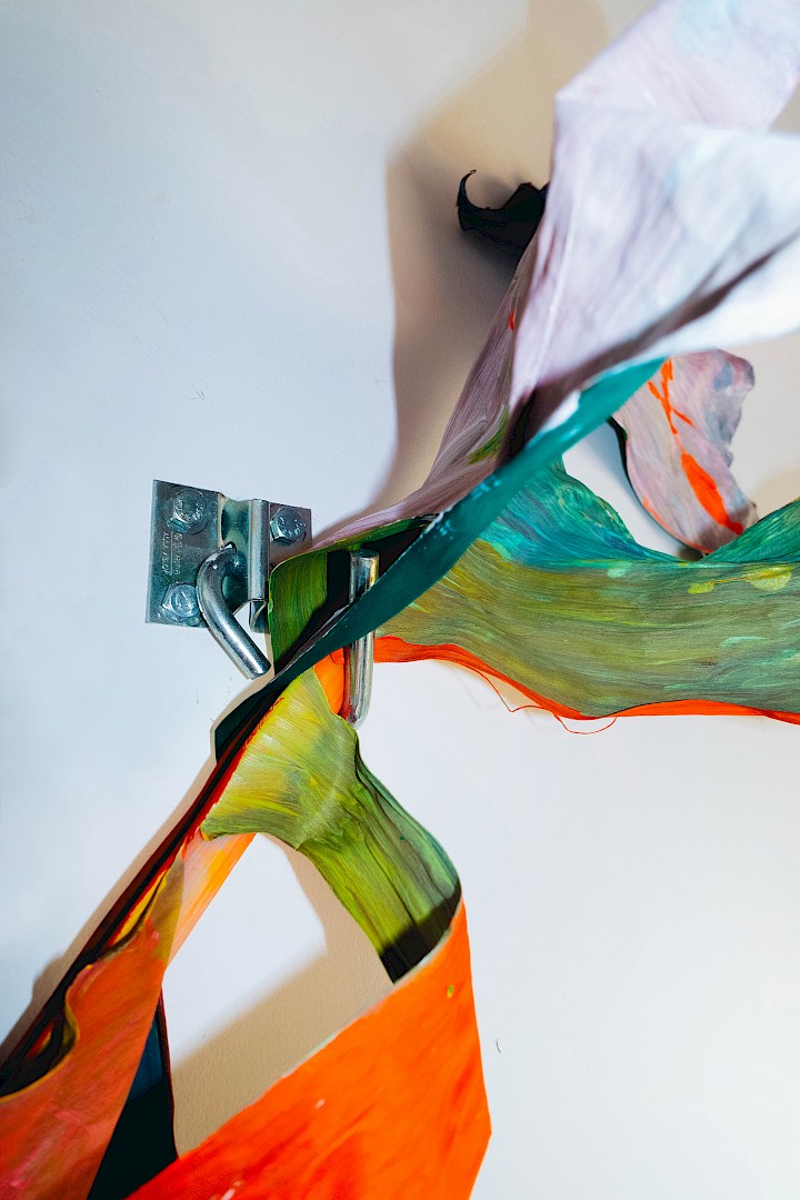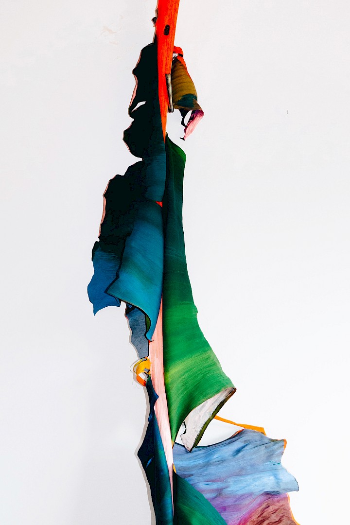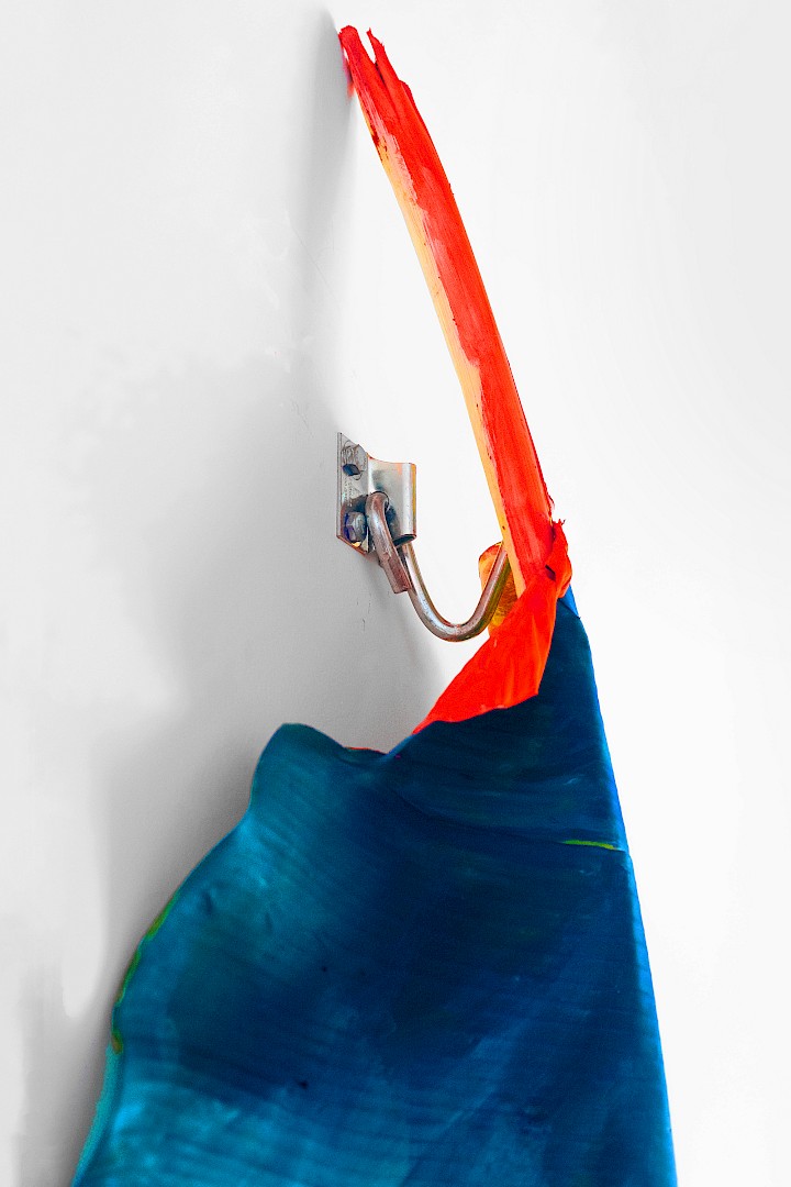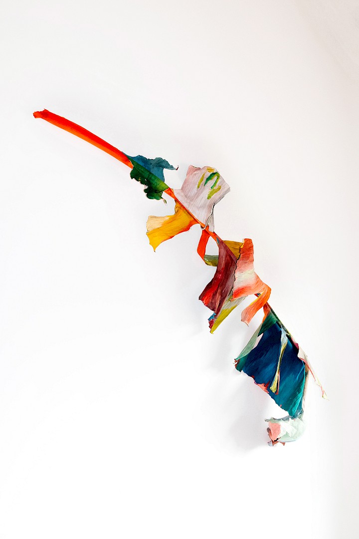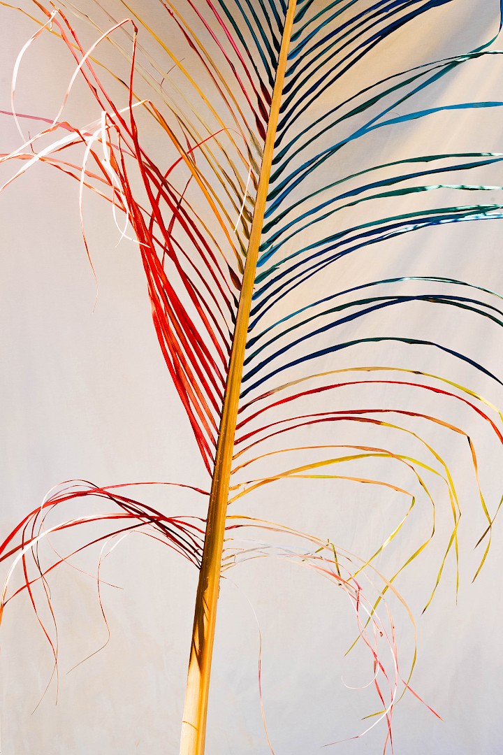 Dans LA HOJARASCA, Elsa Leydier explore notre rapport paradoxal à la nature, entre fascination et destruction. Elle intervient directement sur des feuilles tropicales (palmiers, bananiers, etc.), choisies pour leur forte charge symbolique dans l'imaginaire occidental, en leur appliquant de la peinture. Les végétaux, une fois peints, s'asphyxient et se figent, passant d'éléments vivants à des sculptures fragiles.