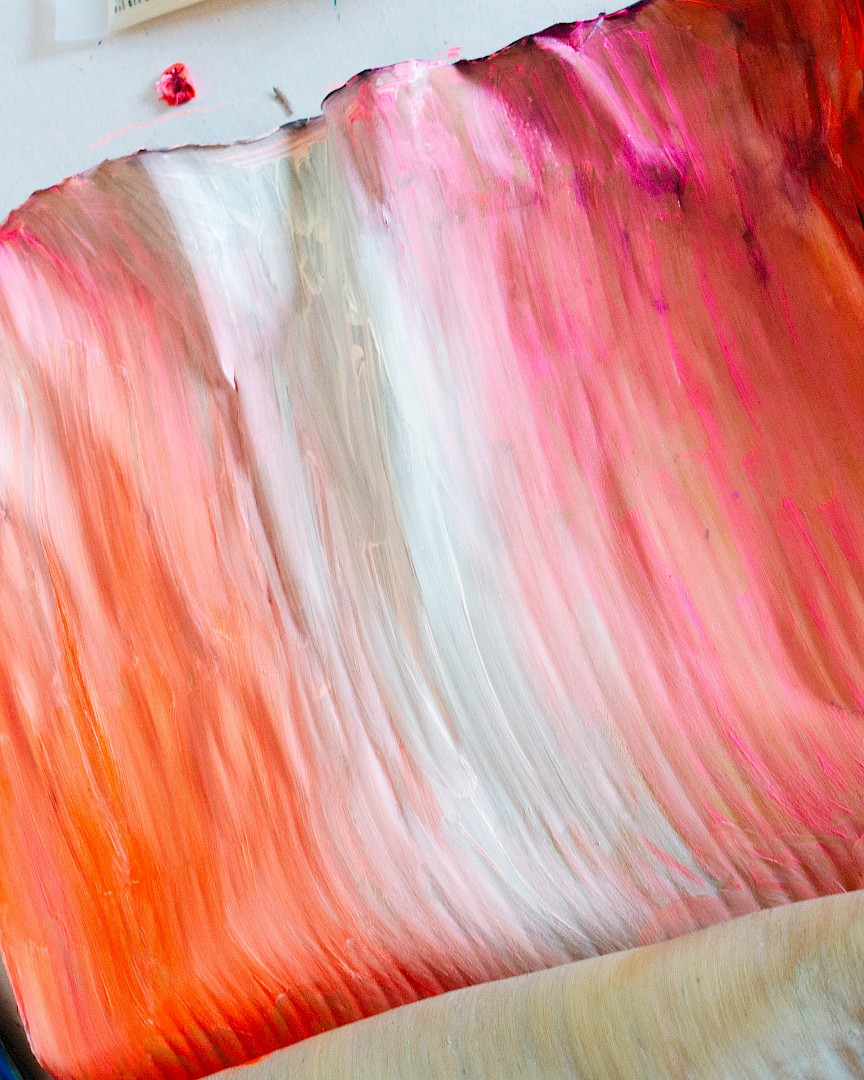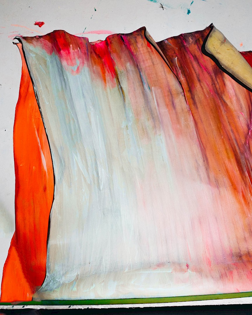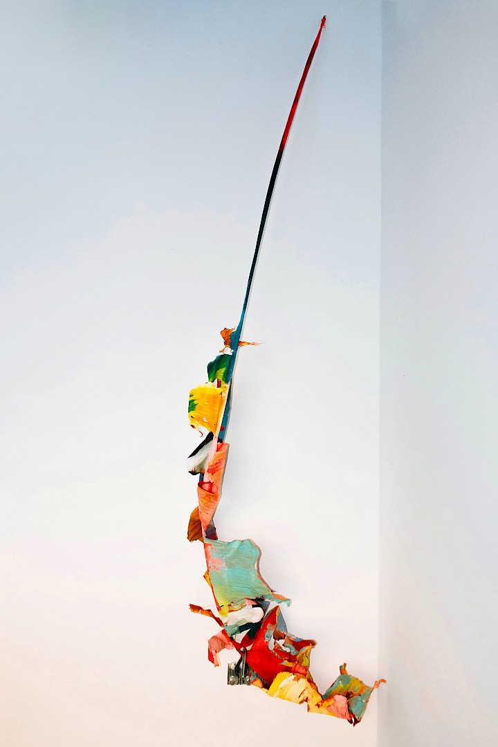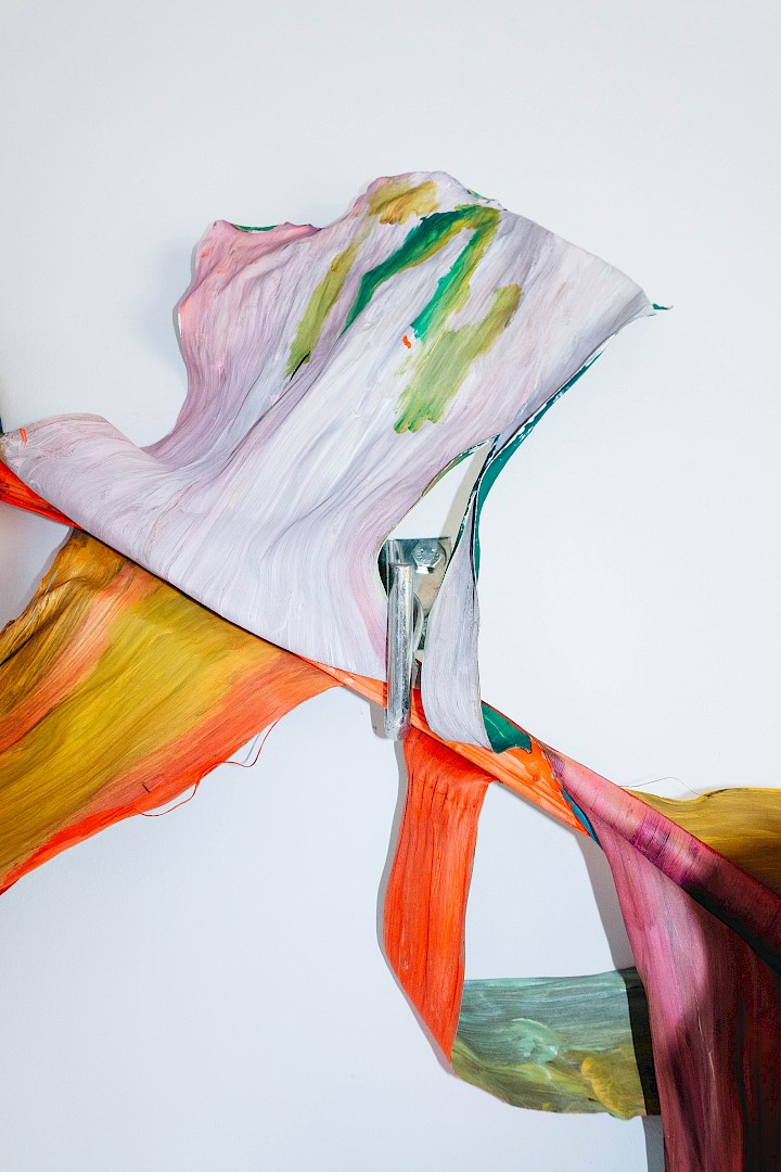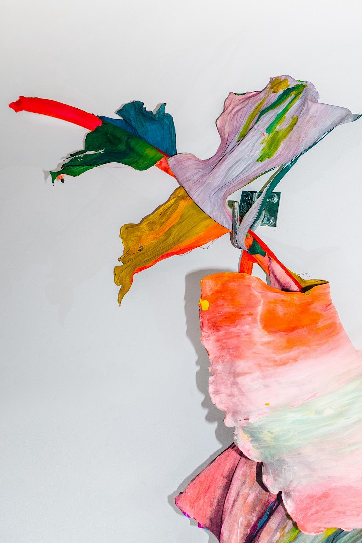 Dans LA HOJARASCA, Elsa Leydier explore notre rapport paradoxal à la nature, entre fascination et destruction. Elle intervient directement sur des feuilles tropicales (palmiers, bananiers, etc.), choisies pour leur forte charge symbolique dans l'imaginaire occidental, en leur appliquant de la peinture. Les végétaux, une fois peints, s'asphyxient et se figent, passant d'éléments vivants à des sculptures fragiles.